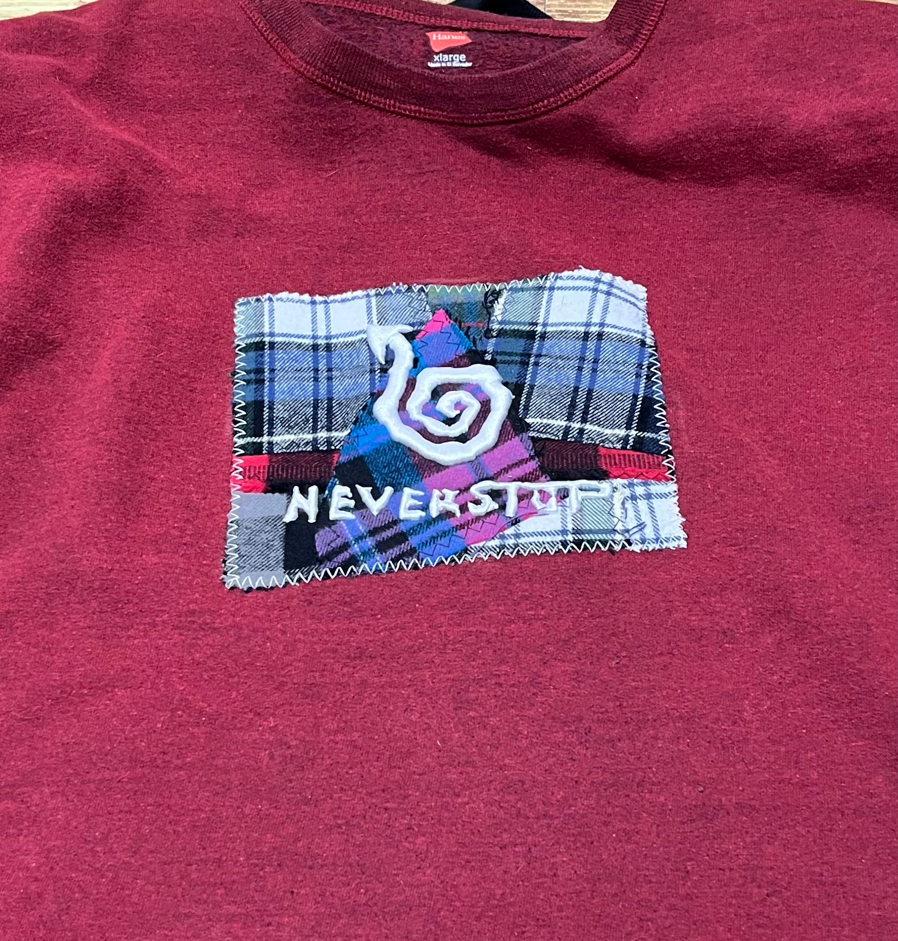 Puff embroidery sewn on a unique fabric swatch which is sewn into a thrifted crewneck found in Pennsylvania