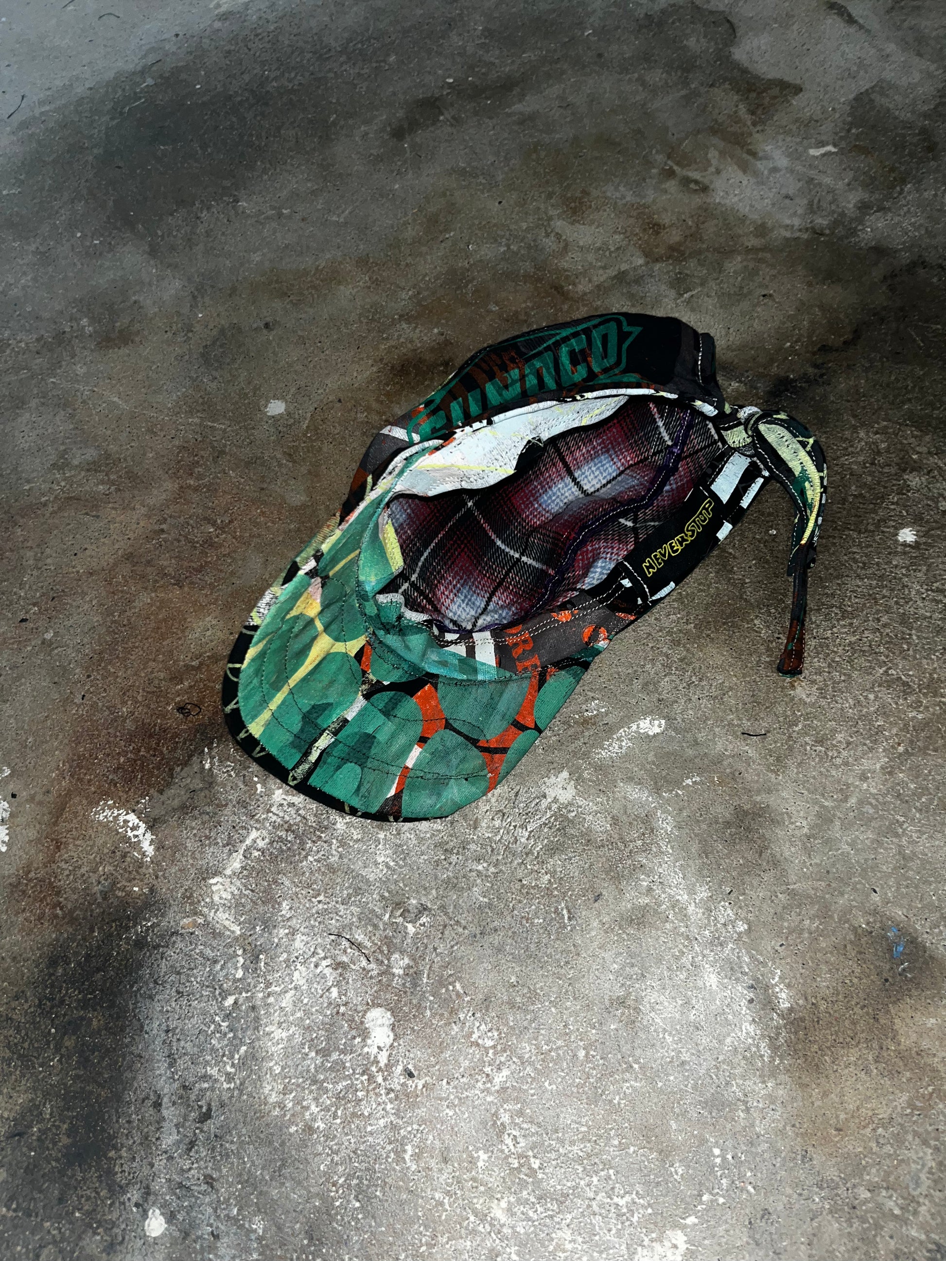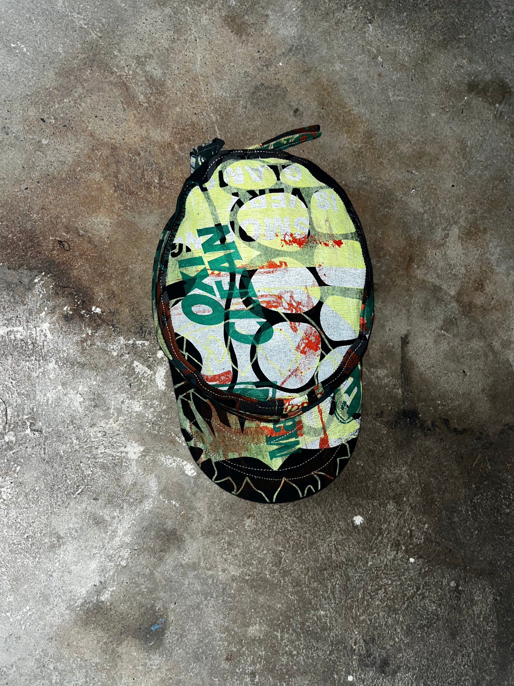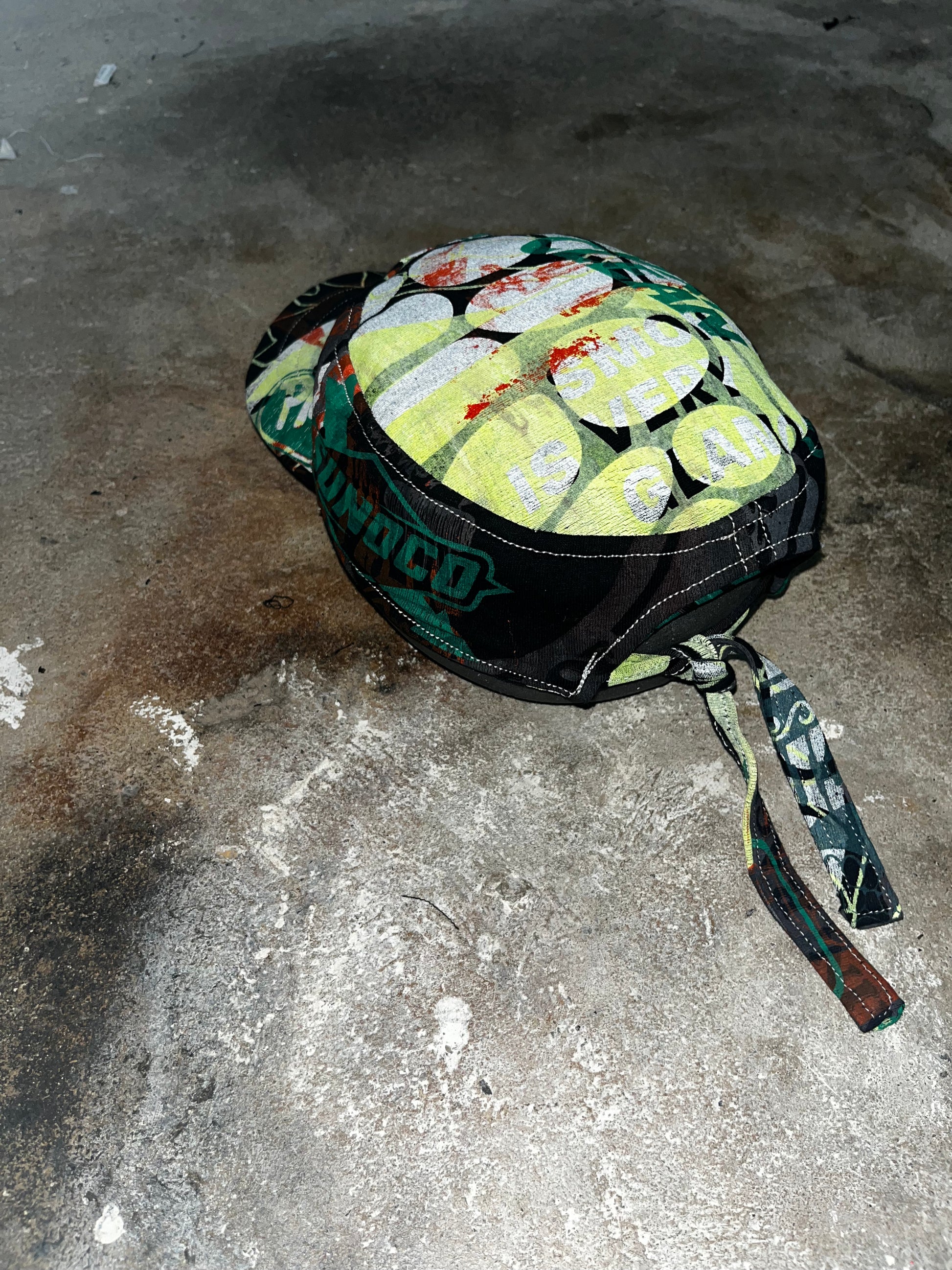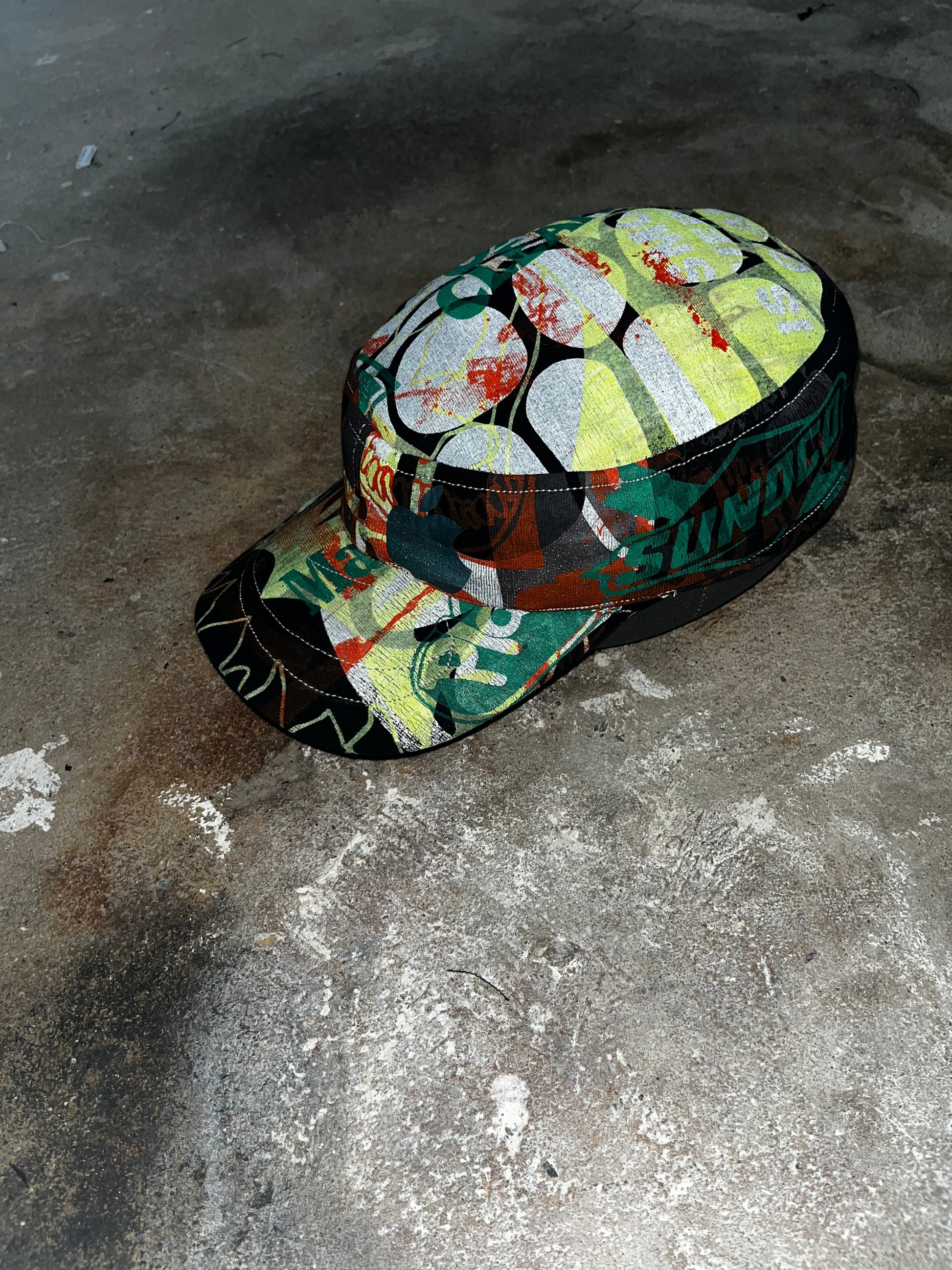 This hat was made from a shirt designed by the brand Creamy studios.